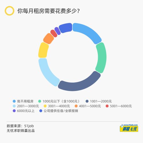 众所周知,衣食住行的“活”占了职场人工资的大头。根据前程无忧的调查,24%的受访者月租花费1001-2000元,17%的受访者月租花费2001-3000元,18.5%的受访者月租花费3000元以上,其中近5%的受访者月租花费5000元以上。也有17%的受访者表示不需要租房,其中70%不需要租房的人居住在非一线城市。此外,还有7%的受访者表示公司会提供宿舍或者全额报销房租,真是令人羡慕。