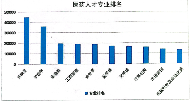 皇冠体育网址人力研究院对500万+医药从业人员的专业进行分析,排名前十的分别为药学类、护理学、生物类、工商管理、会计学、医学类、化学类、计算机类、市场营销、机械设计与自动化类。如下图: