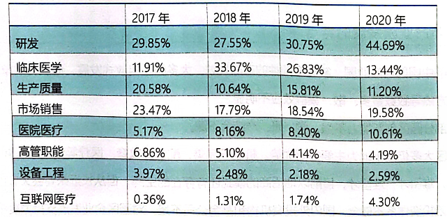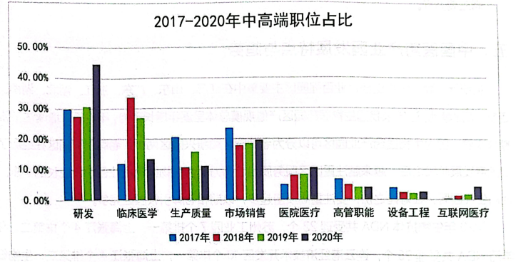 (1)研发类职位一直是近几年中高端职位的招聘重点,2017年、2019年、2020年招聘需求最旺盛的均是研发类岗位,尤其是2020年研发职位占比高达44.69%;