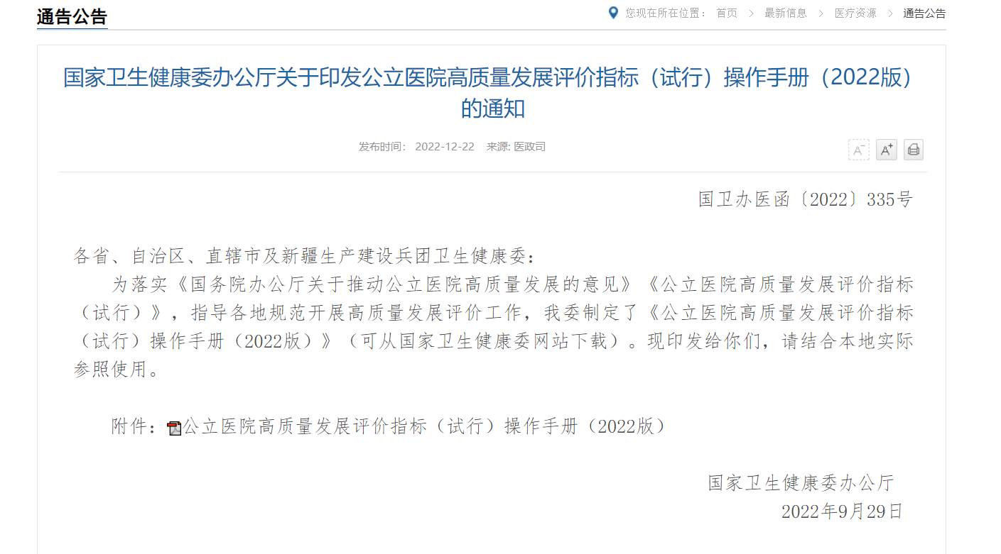 昨日,国家卫生健康委办公厅发布了关于印发公立医院高质量发展评价指标(试行)操作手册(2022版)的通知,以下是具体内容: