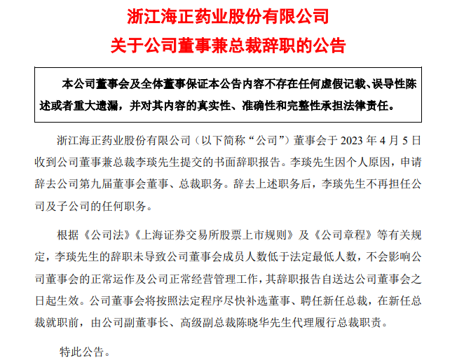 4月6日晚,浙江海正药业股份有限公司公告称,公司董事兼总裁李琰因个人原因申请辞去海正药业第九届董事会董事、总裁职务。辞职后,李琰不再担任海正药业及子公司的任何职务。
