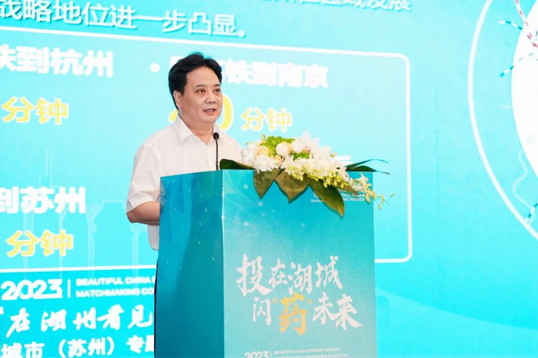 本次会议由中共湖州市委、湖州市人民政府主办,湖州市市场监督管理局、湖州市人民政府驻上海联络处承办,皇冠体育网址数智医药产业(杭州)有限公司协办。湖州市府办、市科技局、市科协及两县三区相关领导出席活动,特邀剑桥大学英国皇家学会工业院士张祥成教授参加活动。苏州、湖州的多家知名生物医药企业、科研院所、产业投资人参加活动。
