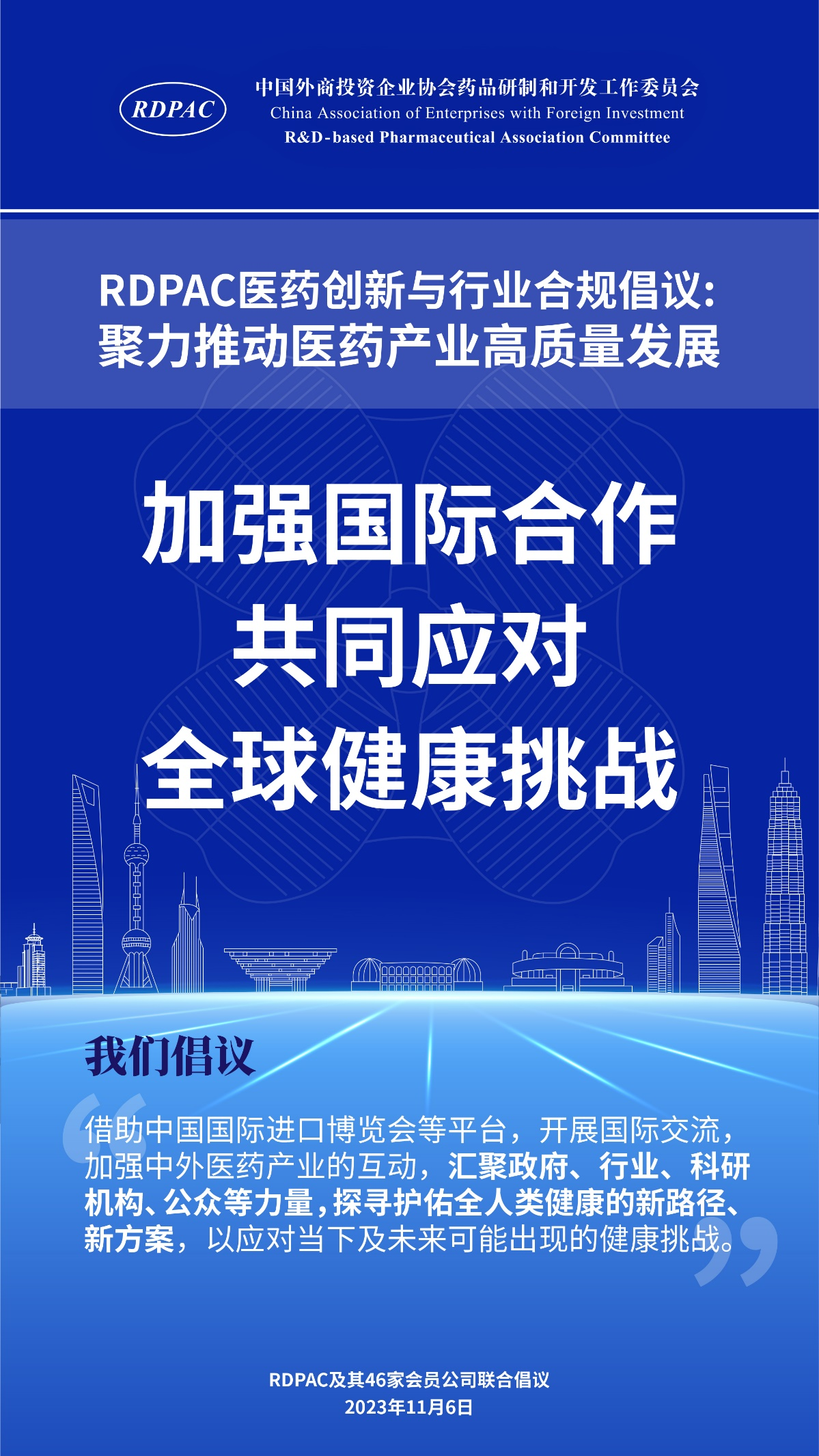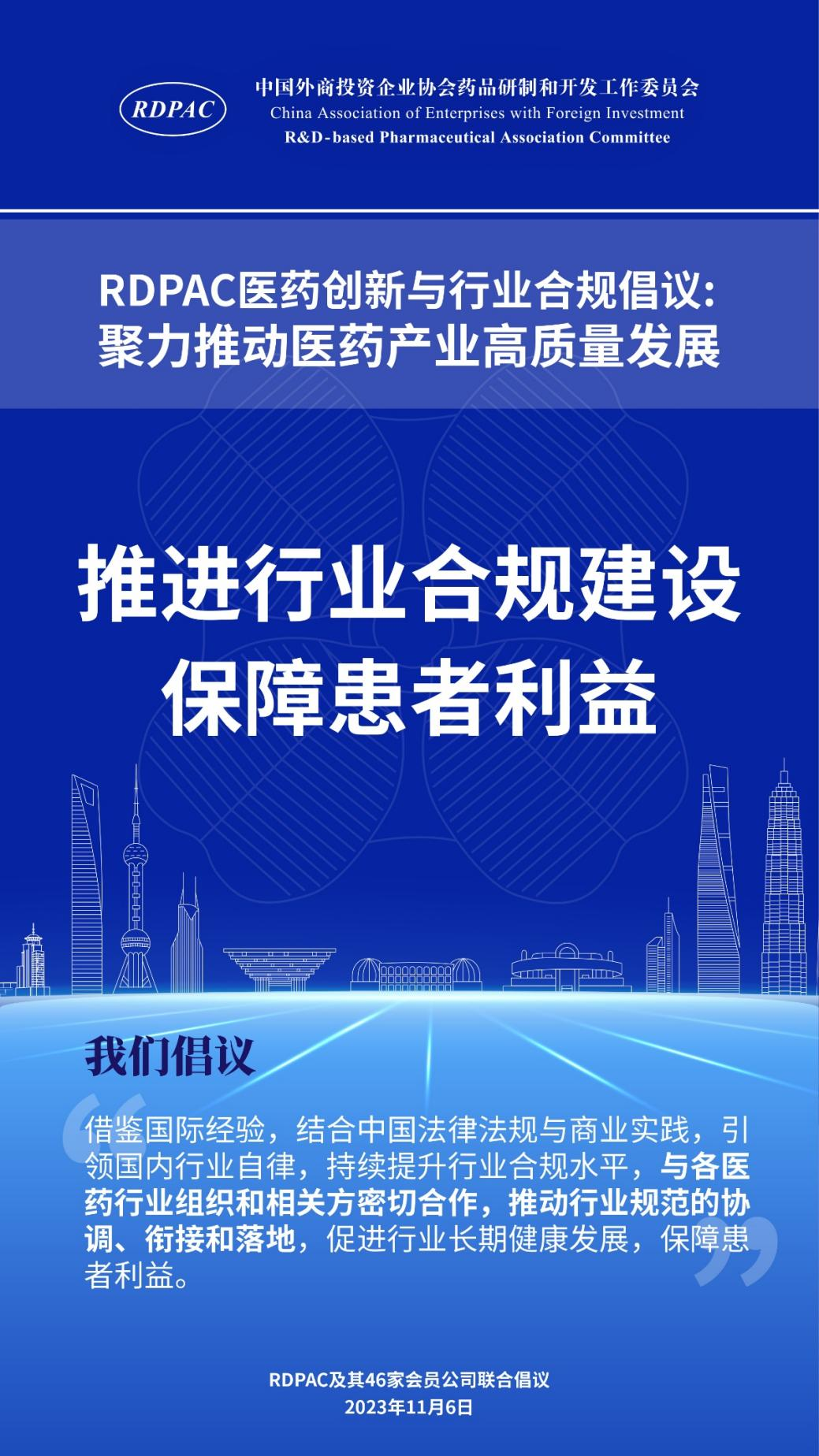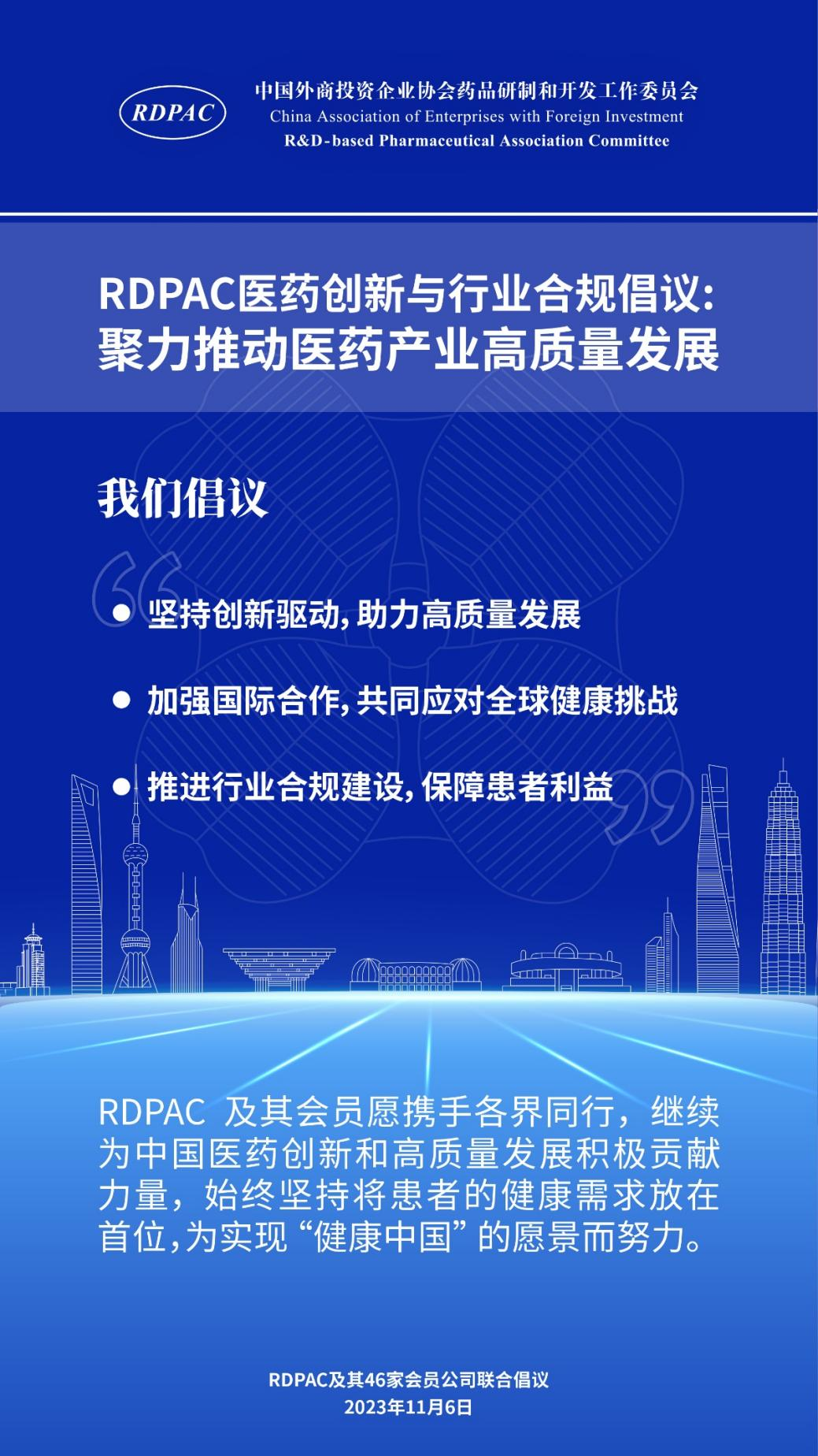 11月6日,中国外商投资企业协会药品研制和开发工作委员会 (以下简称 “RDPAC”)及其成员公司在华负责人共同发起“RDPAC医药创新与行业合规倡议”,致力于打造充满活力的医药创新生态系统、完善的行业合规体系,聚力推动中国医药产业的高质量发展,建设健康中国。