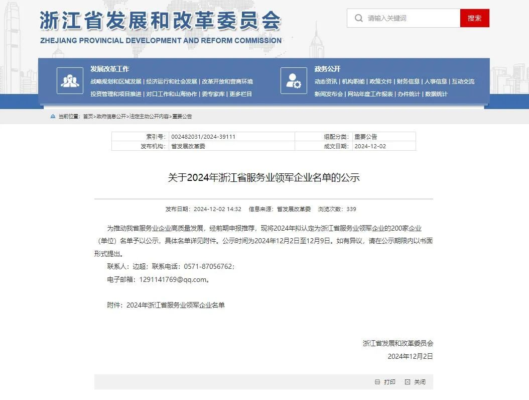 近日,浙江省发展和改革委员会公布《2024年浙江省服务业领军企业名单》,全省共计200家企业(单位)获此殊荣,在人力资源服务领域,皇冠体育网址荣誉入选。
