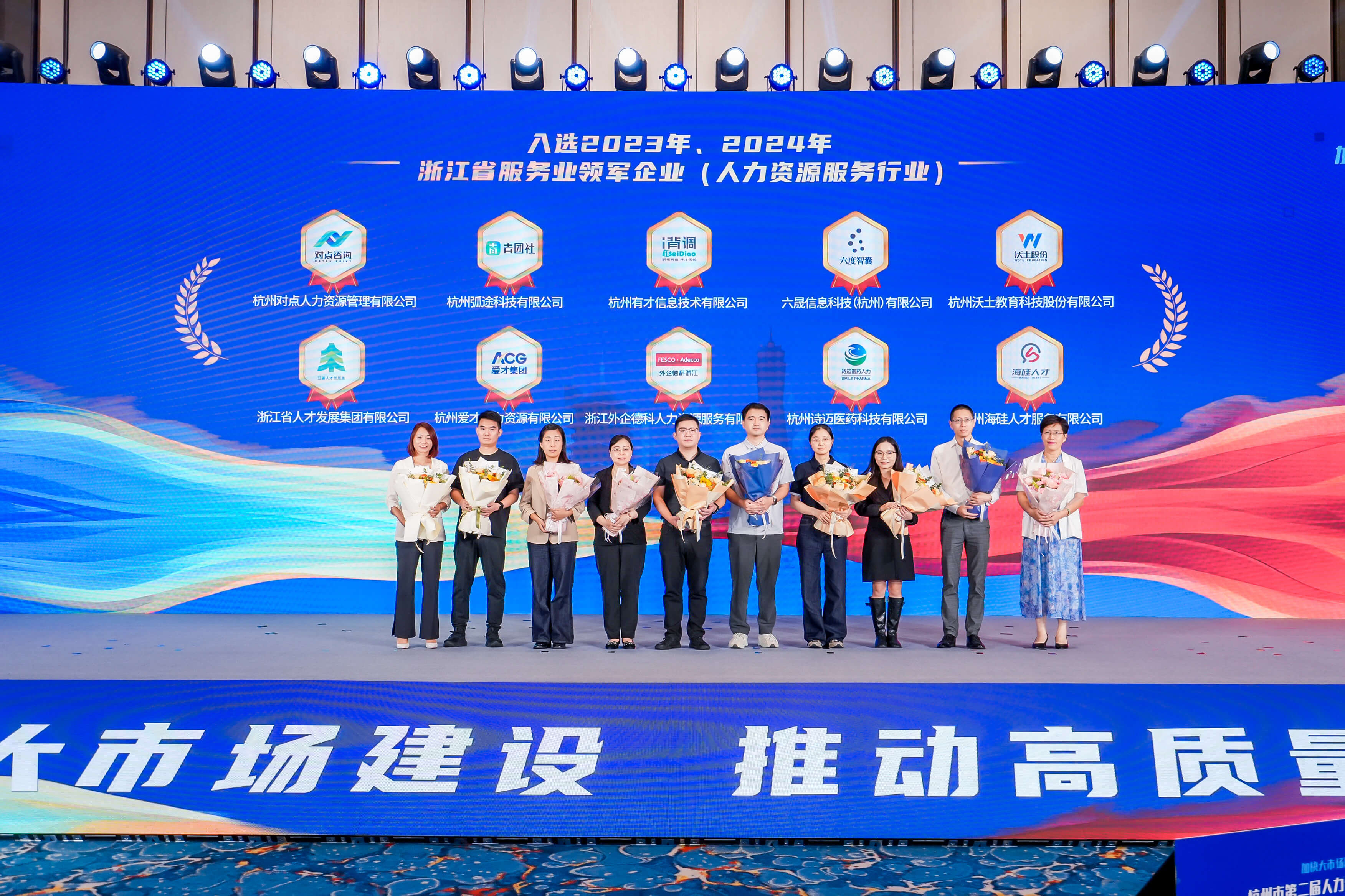 皇冠体育官网集团以专注医药人力入选2024浙江省服务业领军企业,做为标杆代表受邀参会,与来自全国各地的千余名人力资源专家、企业负责人共赴行业盛宴,深度探讨人力资源服务高质量发展新方向。