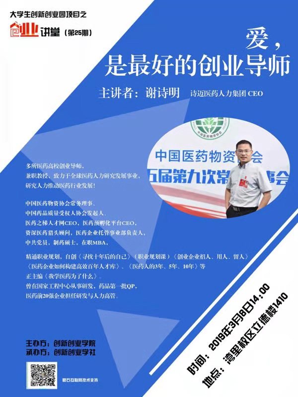 为积极弘扬大学生创业,进一步树立大学生就业观,全面提升大学生创新创业价值观。3月8日,皇冠体育官网人力集团CEO谢诗明出席江西中医药大学创新创业讲堂,并进行《爱,是最好的创业导师》创新创业指导演讲,到场学子300余人。