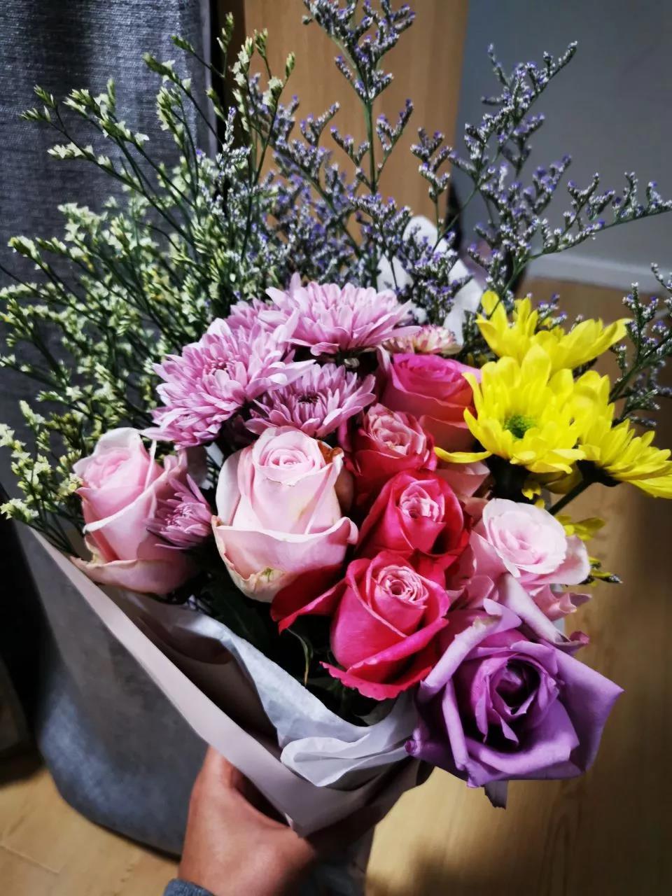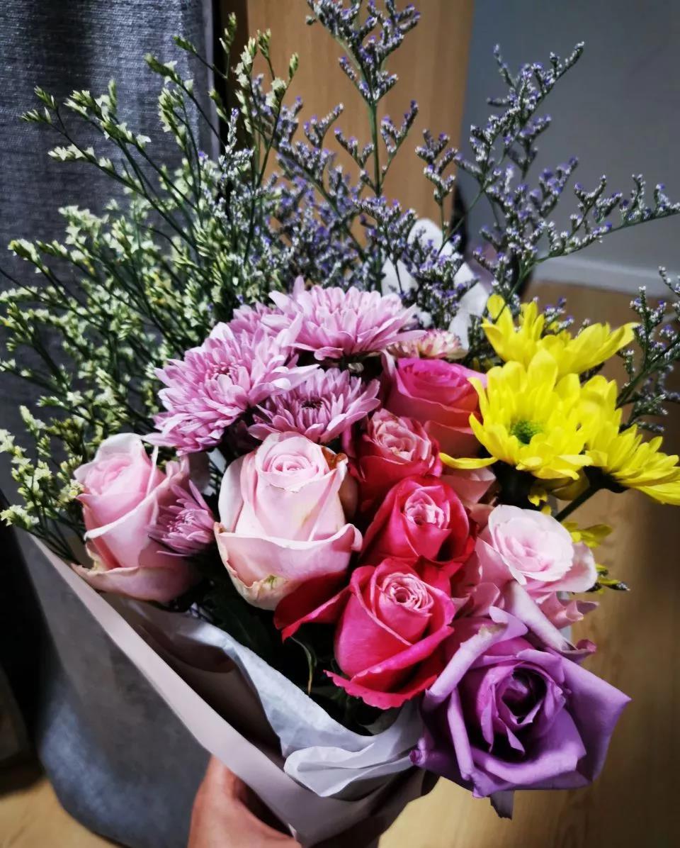 材料准备就绪,满天星、菊花、粉玫瑰、白玫瑰...就在等“花艺师”们来释放它们的美。