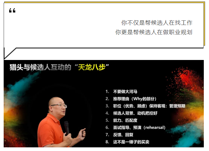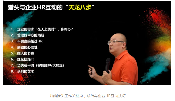 金老师站在企业与候选人的角度上审视猎头工作,指出猎头应做到知己知彼,百战不殆,与企业高层交流,学习精英大局观。